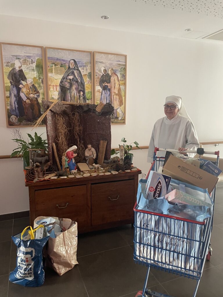 A l’initiative de l’APEL, les élèves et leurs familles, ont été invités à collecter des produits dhygiène, au bénéfice de la Maison des Petites Sœurs des Pauvres de Nantes. A cette occasion, deux Soeurs sont venues à l’école témoigner de leur mission : accueillir, réconforter, soigner et accompagner jusqu’au terme de leur vie, les personnes âgées confiées à leurs soins. Les élèves avaient également confectionné en famille des cartes de Noël pour ces résidents.
